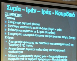 Θα επικεντρωθώ σε τρία «γεωπολιτικά μέτωπα» στα οποία η Τουρκία προσπαθεί να προσαρμόσει την πολιτική της, κατά τη δική μου εκτίμηση, τουλάχιστον στην ευρύτερη περιοχή της Μέσης Ανατολής. Τα τρία μέτωπα είναι: 1) Ο αραβικός κόσμος και οι αραβικές εξεγέρσεις, 2) η Συρία, το Ιράν, το Ιράκ, και το Κουρδικό, και 3) το Ισραήλ, η Κύπρος, και η Ελλάδα στην Ανατολική Μεσόγειο.